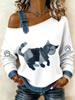 Damen-Jeans-Katze bedrucktes Einzel-Schulter-Sweatshirt