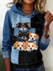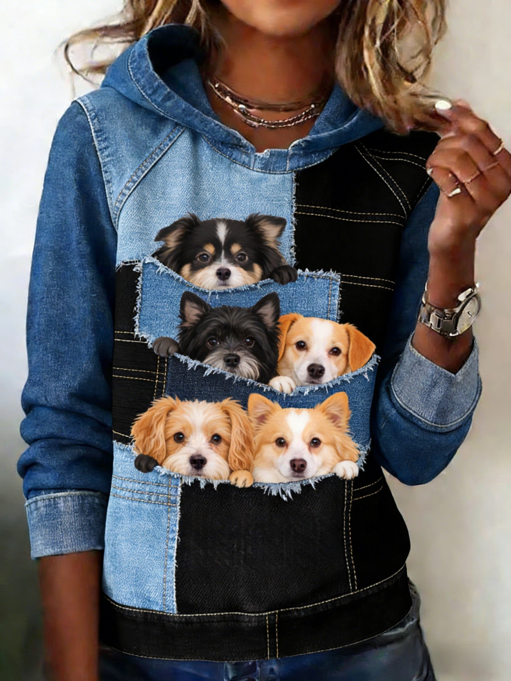 Damen niedlicher Tier hund Peek-a-Boo Patchwork Denim Art bequemes Kapuzen-Sweatshirt