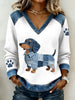 Damen schöne Dackel Hunde muster Denim Patchwork V-Ausschnitt Top