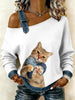 Damen Vintage Cat Patchwork Print lässig schulter freies Sweatshirt