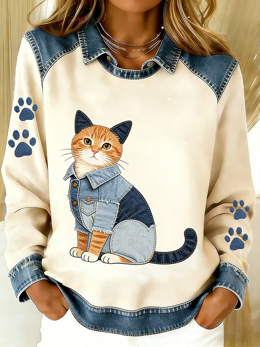 Damen Vintage Denim Patchwork Top mit Tier kunstdruck, lässig und bequem